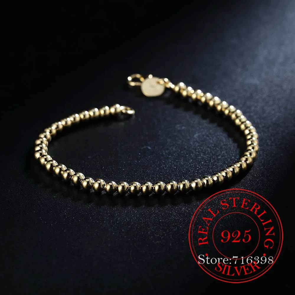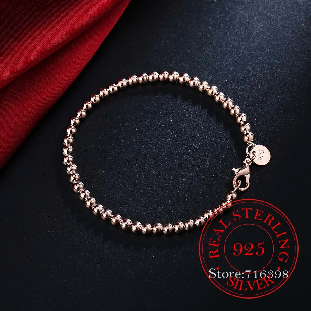 100% Real 925 Sterling silver Bracelet for Women men Homme 4MM Beads Ball Chain Bracelets Bangles Classic Pulsera De Mujer
