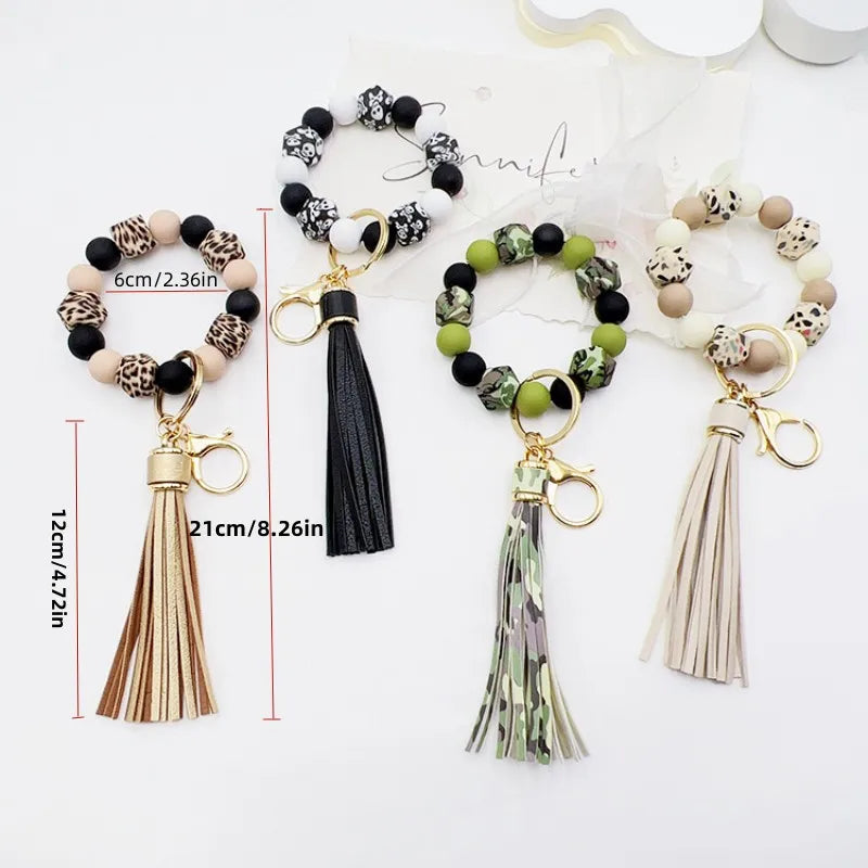 Hemasa Silicone Leopard Print Beads with Tassel Car Keychain /Key Ring