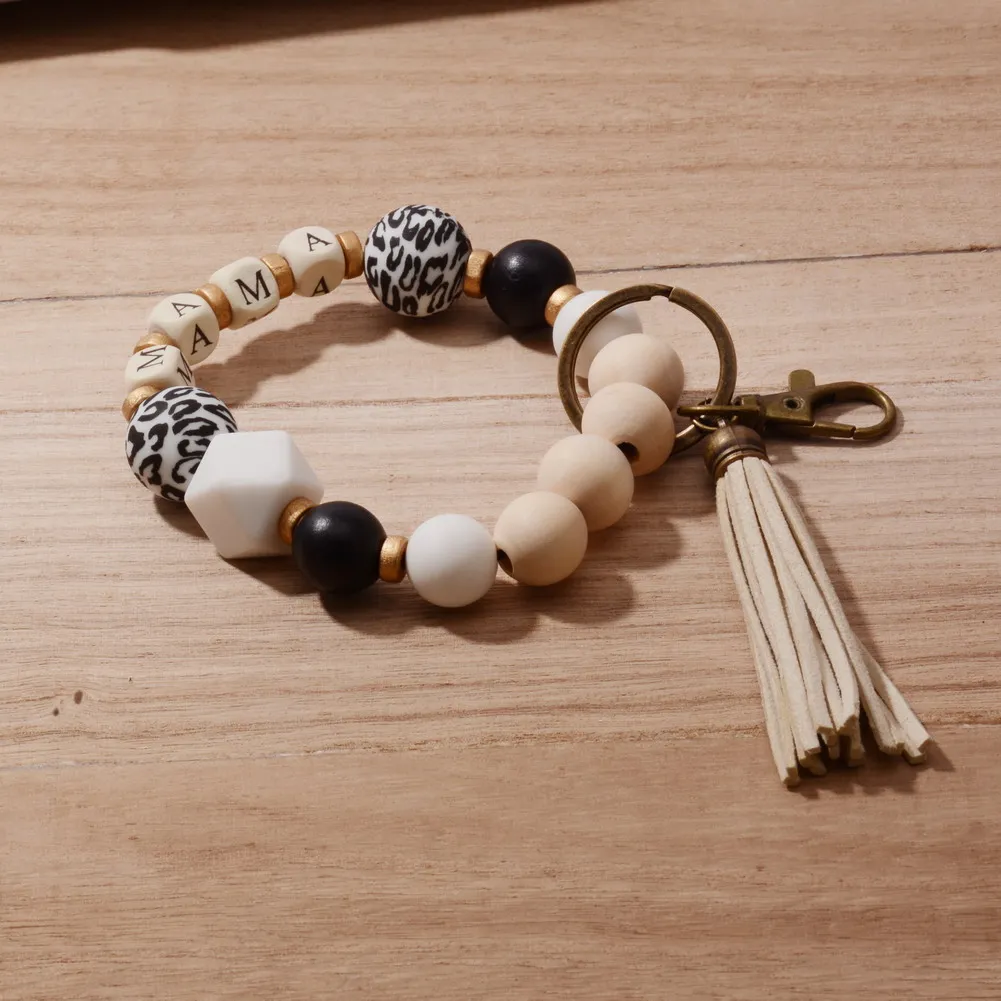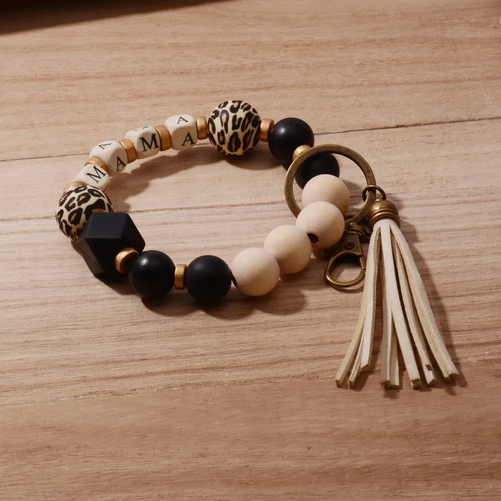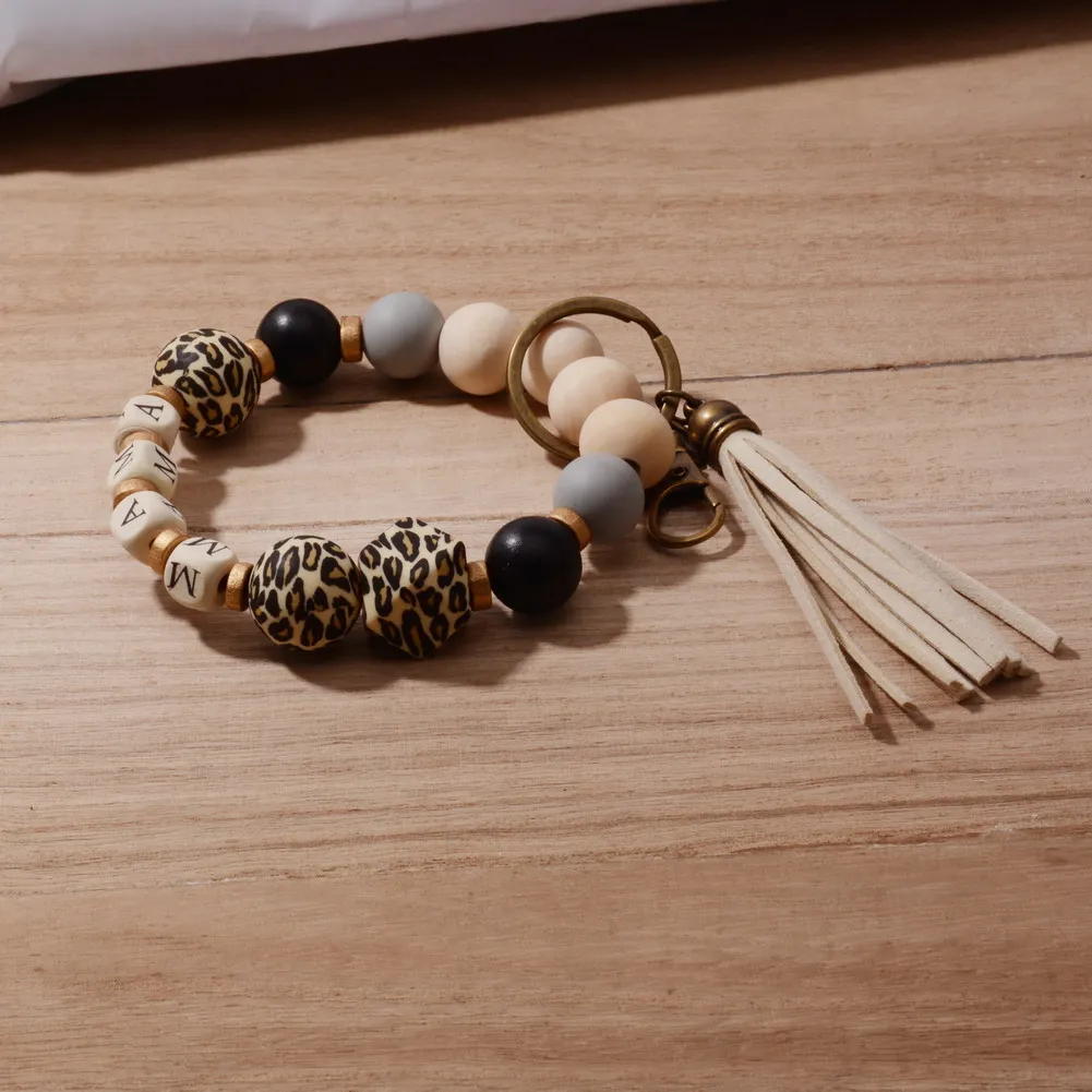 2022 New Boho Leopard Sunflower Silicone Bead Wristband MAMA Key Chain Pendant Custom Name Charm Mother's Day Jewelry Gift