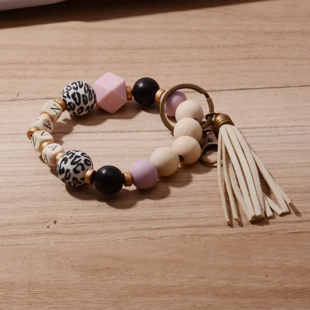 2022 New Boho Leopard Sunflower Silicone Bead NANA Wristband MAMA Key Chain Pendant Custom Name Charm Mother's Day Jewelry Gift