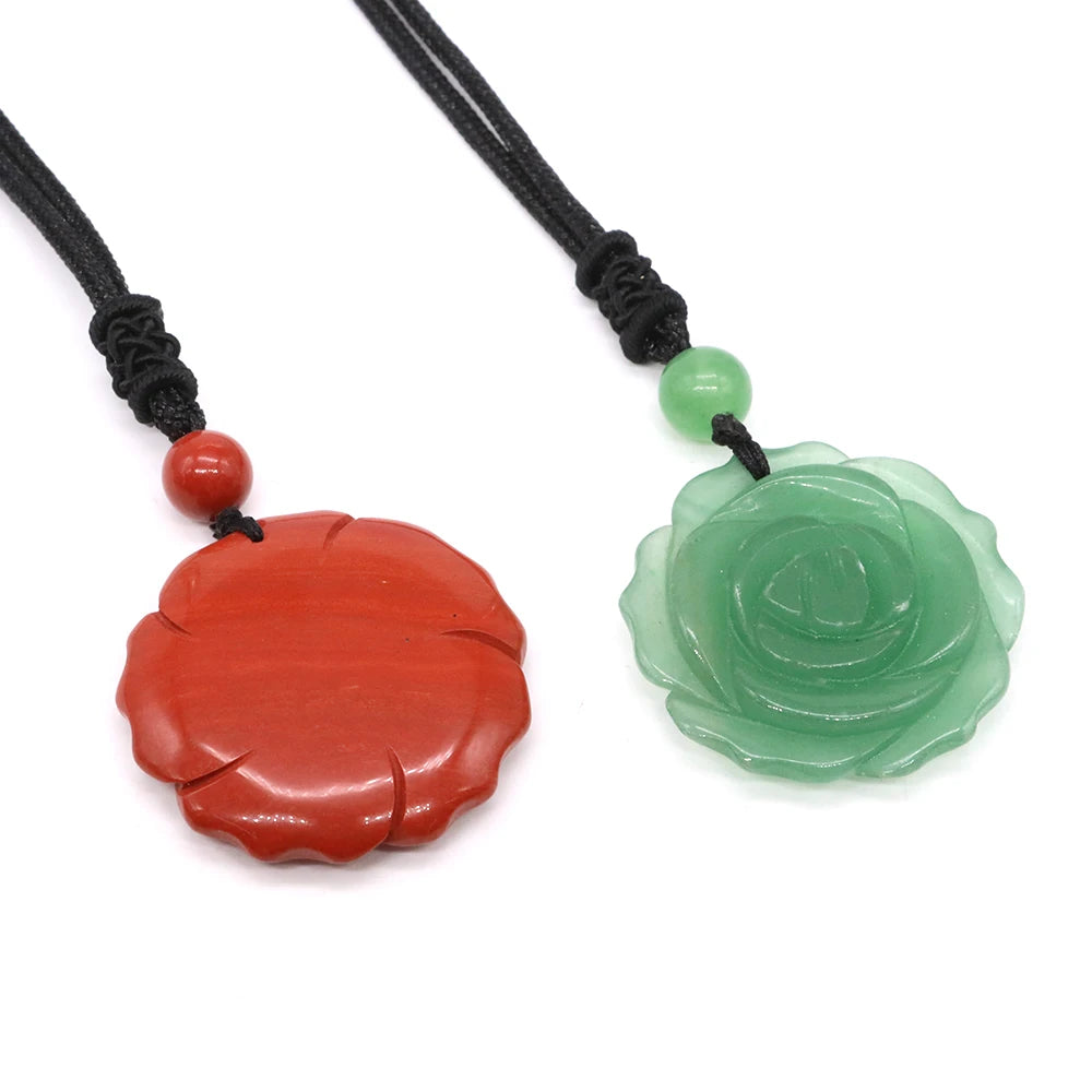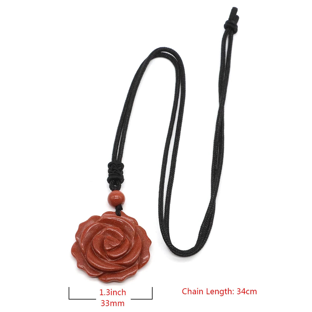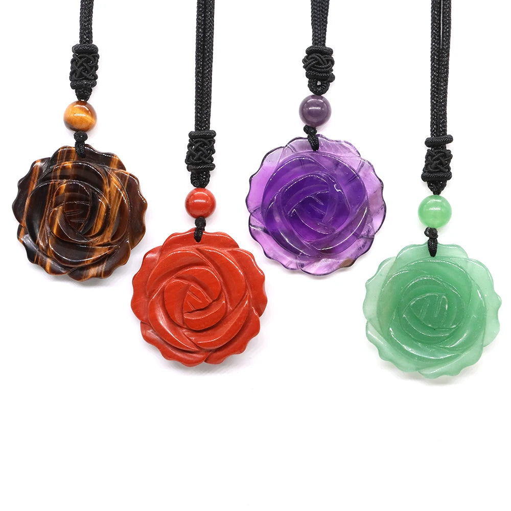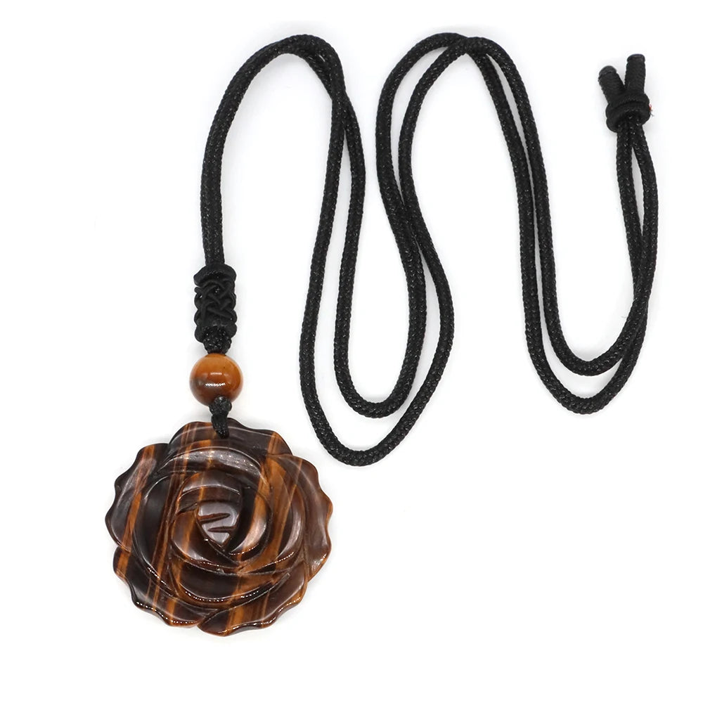 Hemasa 30mm Rose Flower Stone Pendant Necklace/ Natural Healing Crystals Amethyst Tiger Eye Agate Bead Neckalce