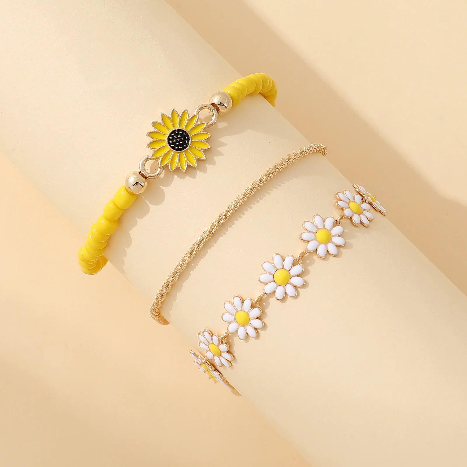 3pcs Cute Daisy Flower Pendant Bracelet Anklet Set for Women Bohemian Beaded Enamel Sunflower Stackable Hand String Jewelry