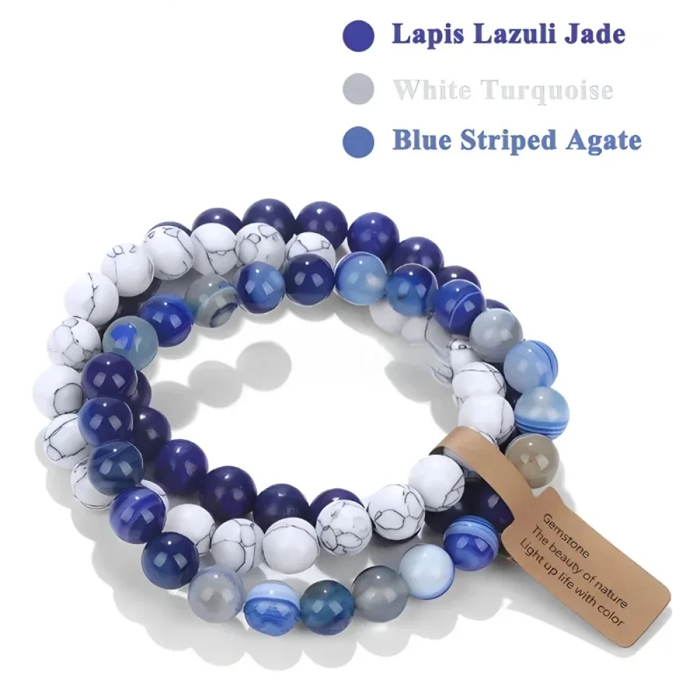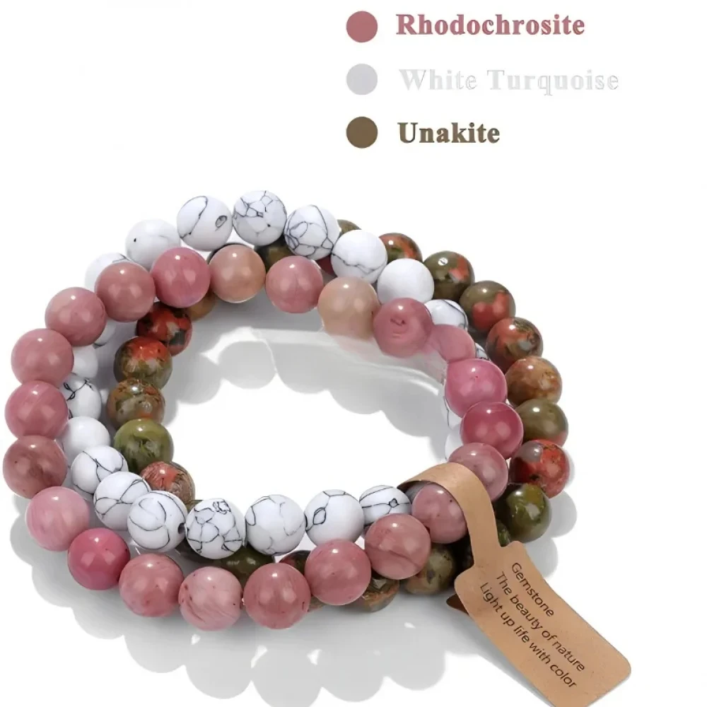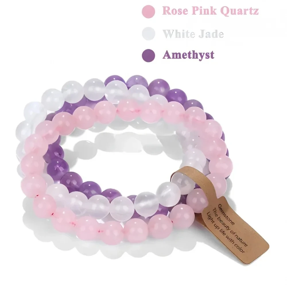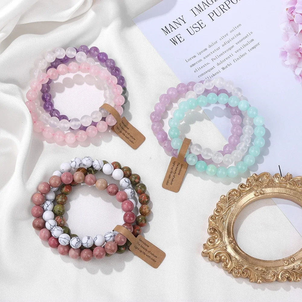 3PCS Natural Stone Bracelet Pink Quartz Citrine Amethyst Turquoise Round Gravel Shape Piece Bead Bracelet Set For Men And Women
