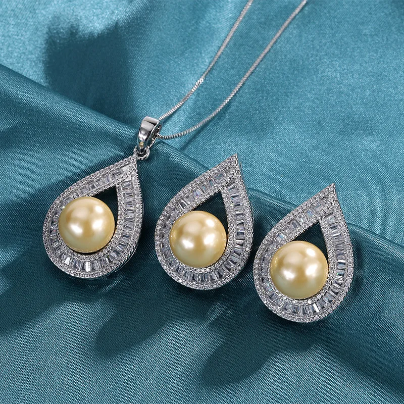 925 Silver Needle 12MM Big Pear Water-drop Earrings Necklace for Women Girls Vintage Dinner Party Gift Zircon Charm Jewelry Set