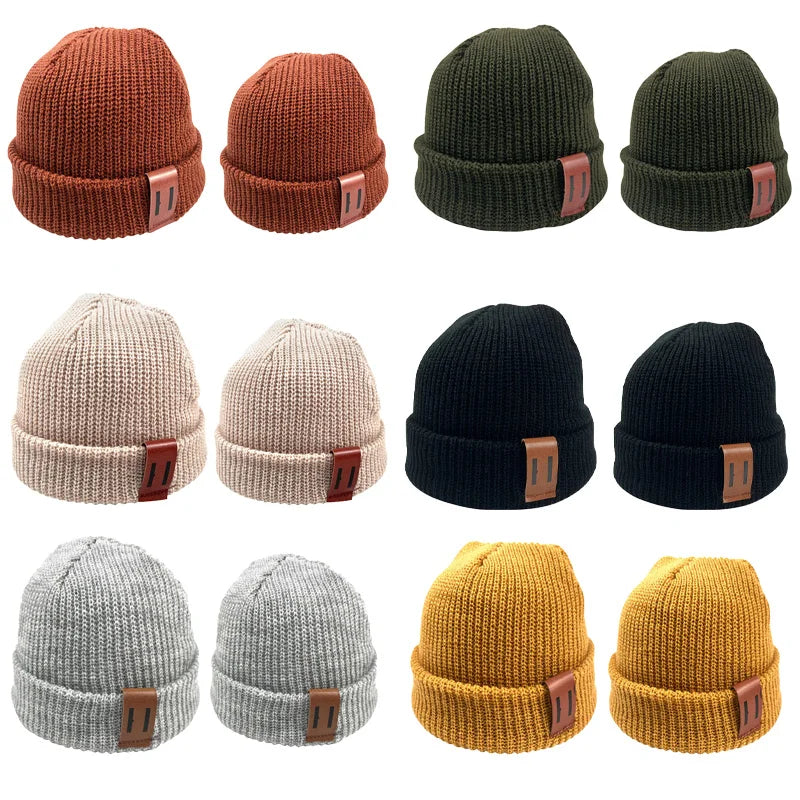 Baby Knit Hat for Boys Girls Autumn Winter Warm Kids Beanie Adult Children Parent-Child Hats Newborn Baby Cap with Leather Label