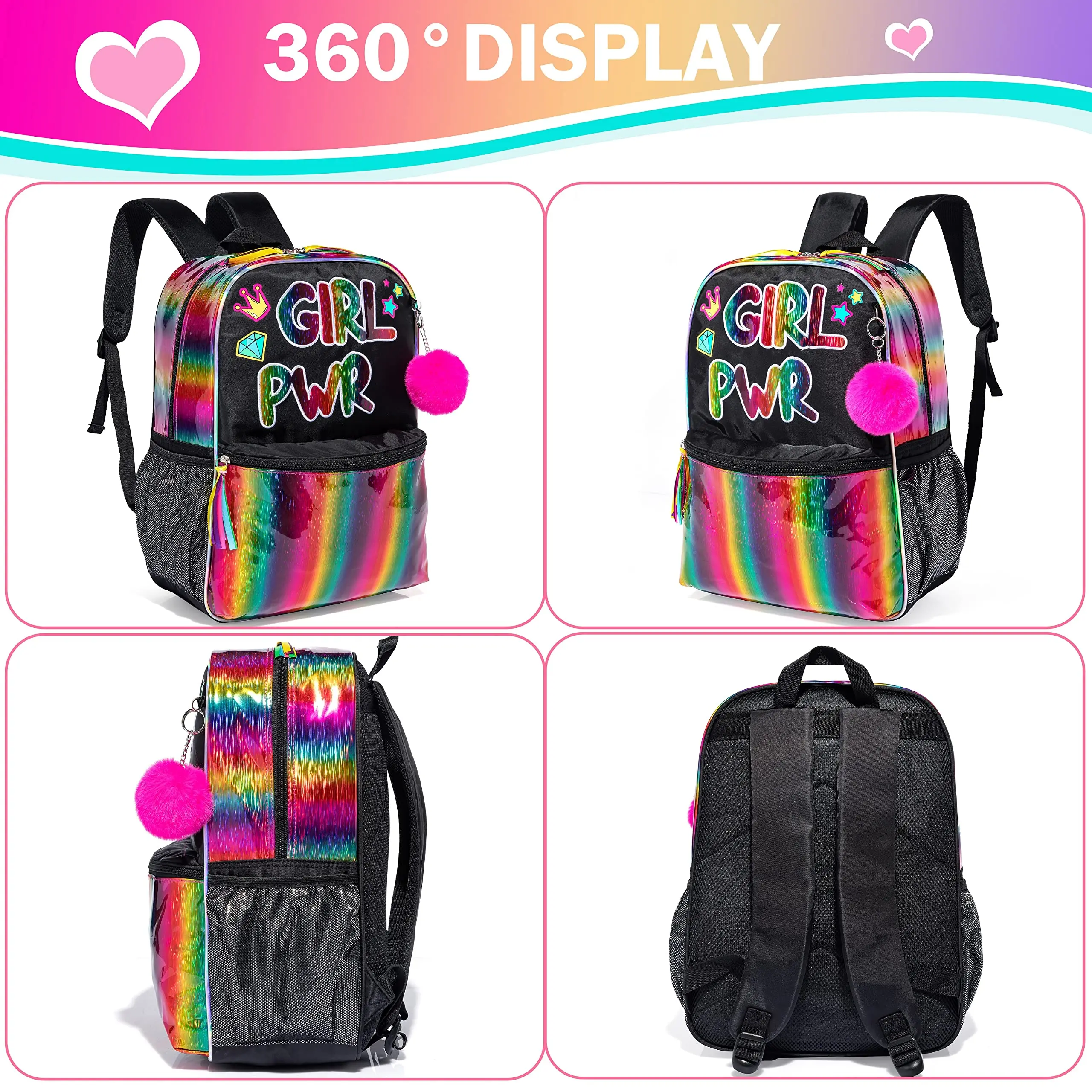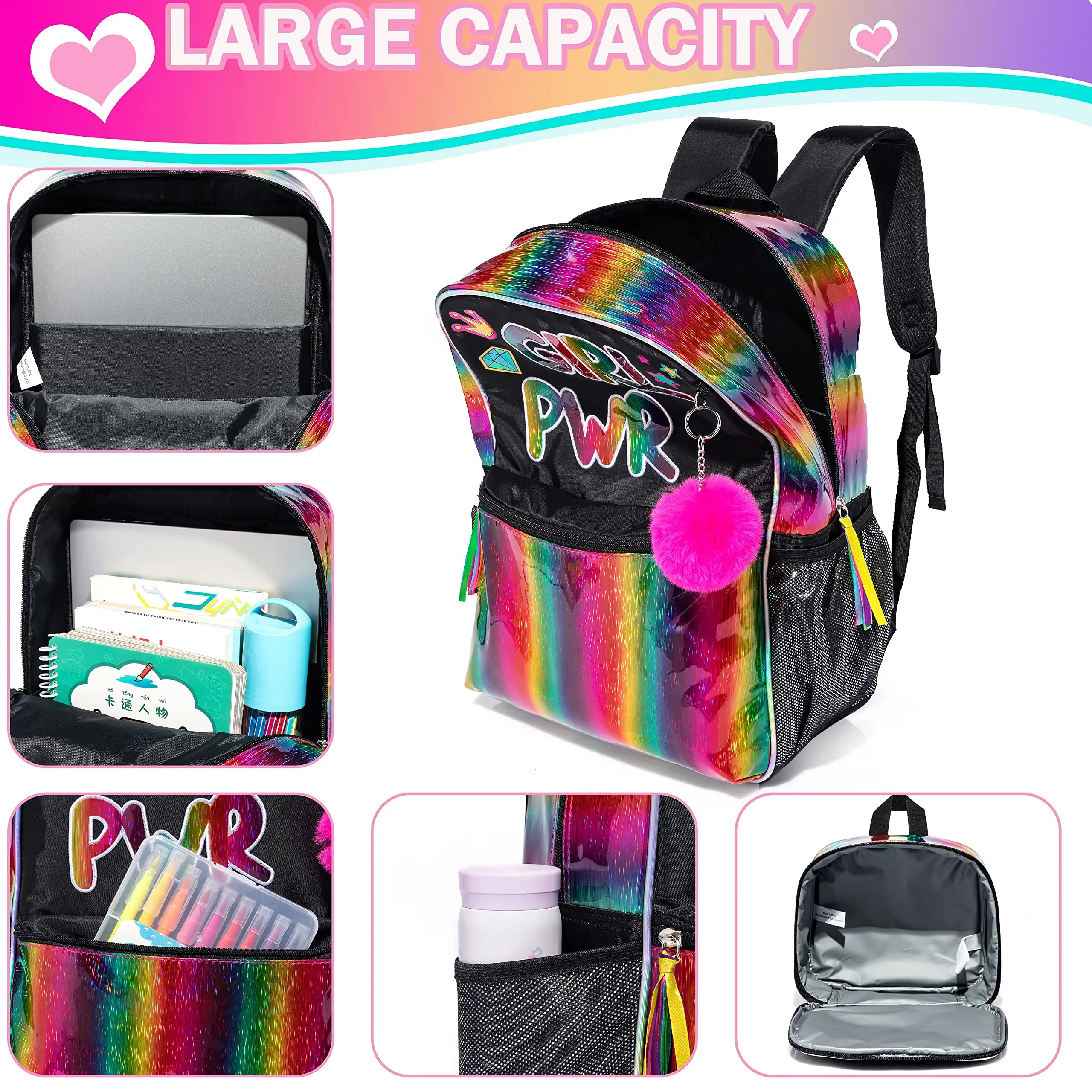 [4 in 1 Girls Backapck Size]You will get 1 backpack,1 lunch box,1 pencil case and 1 pendant.★Backpack:16.5"X11.8"X7.8"Lunch Box:8.6"X9.4"X3"Pencil Case:9"