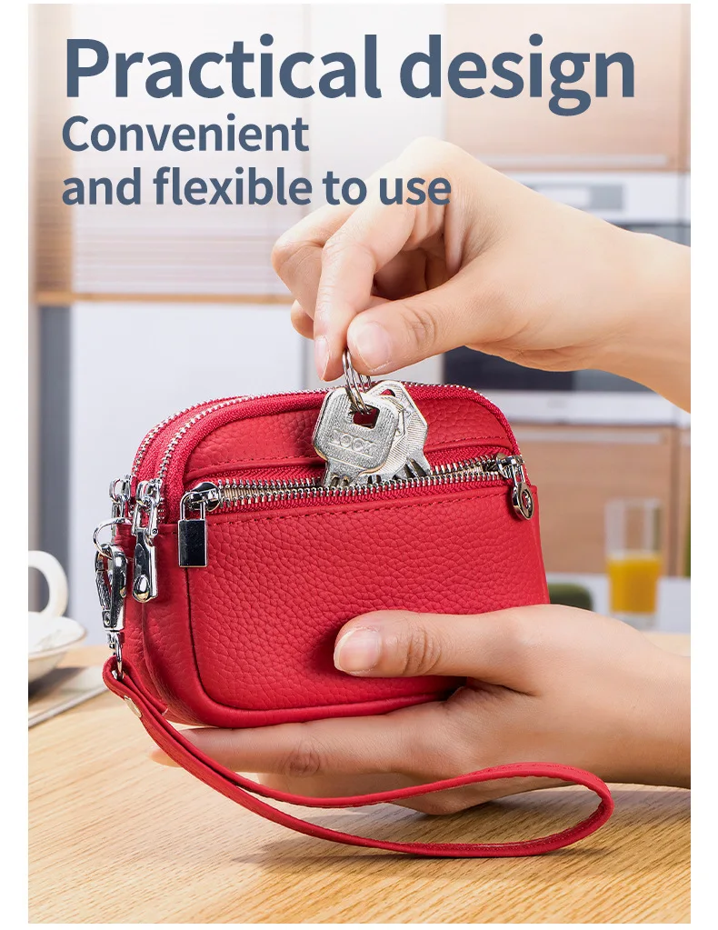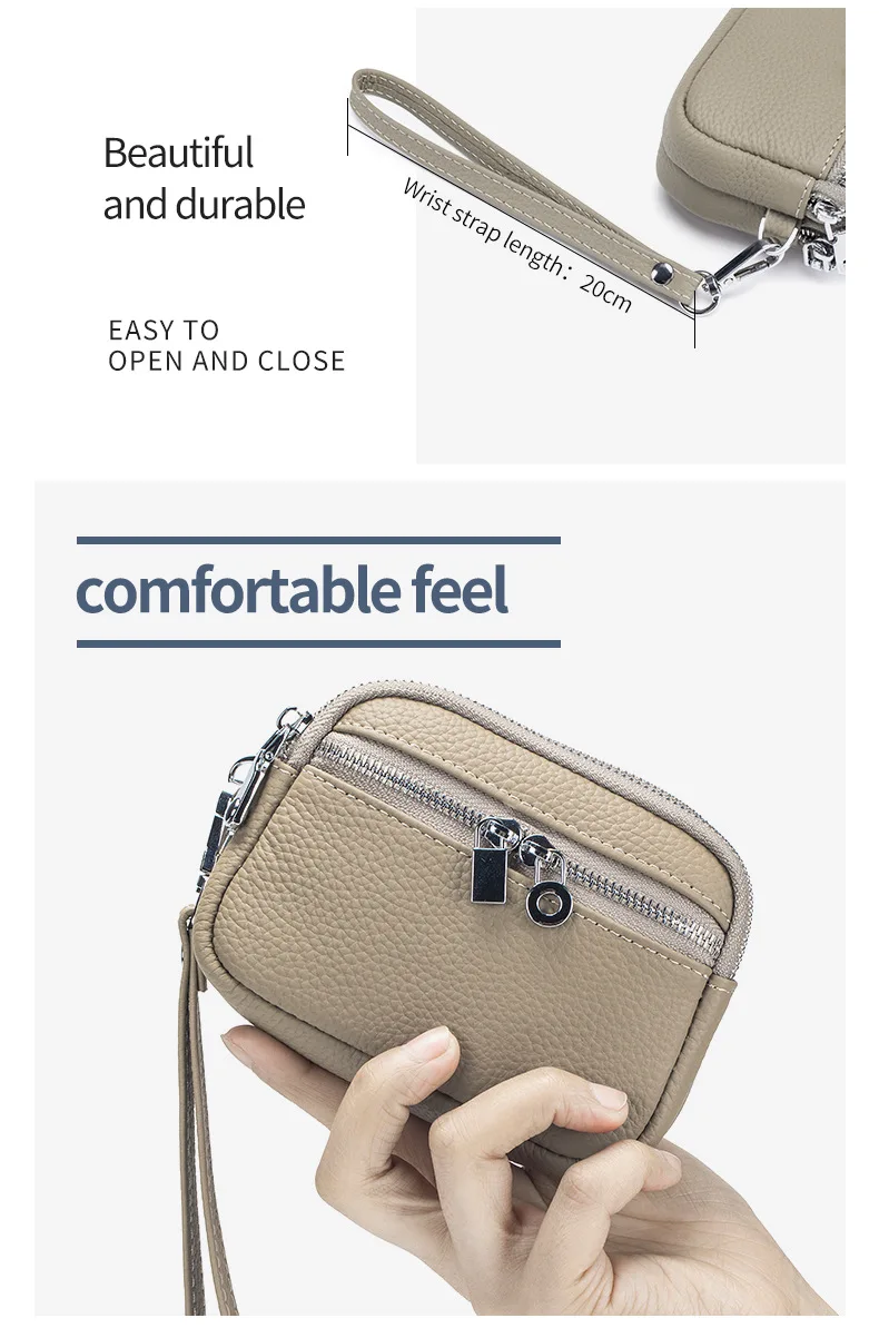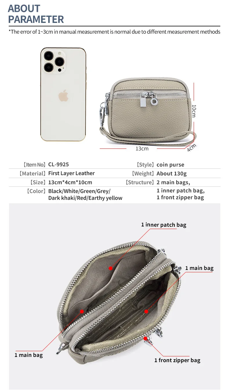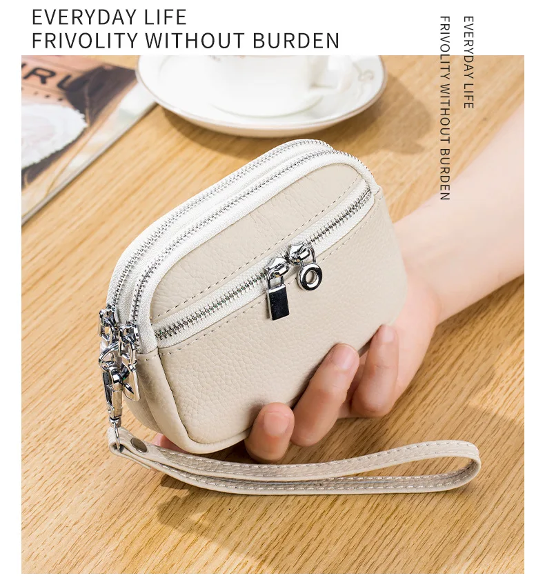 Large Capacity Women's Wallets Genuine Leather Short Coin Purse Leather Zipper Multi-function Mini Clutch Bag with Wrist Strap