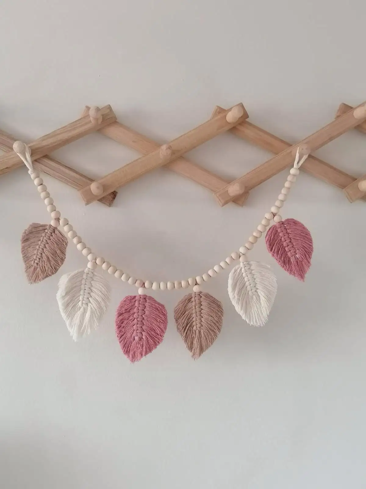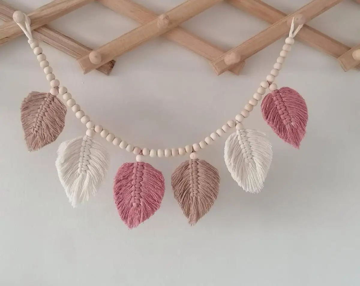 Leaf Macrame Garland , Boho Baby Girl Decoration , Leaf Garland with Wood Beads , Graduation Party , Party Supplies , Fast Shipping