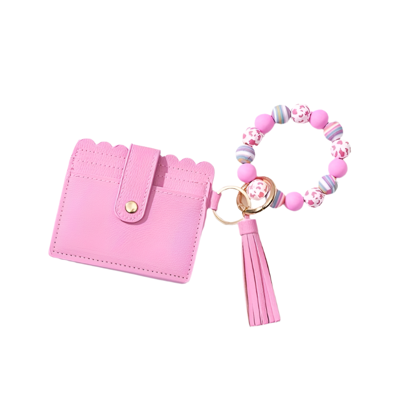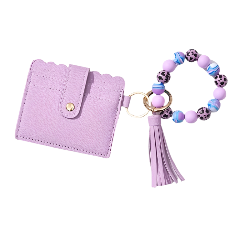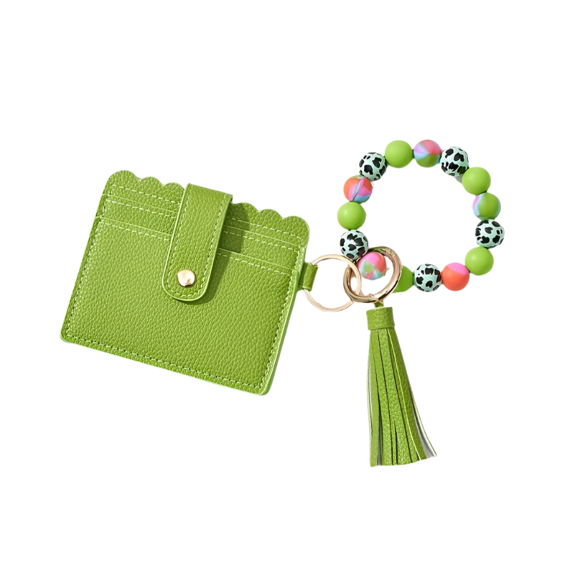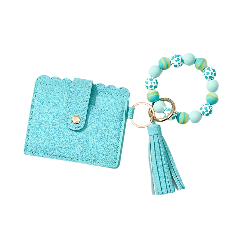 Hemasa Leopard Silicone Wooden Beaded Wristlet Keychain With Wallet /Credit Card Holder /Bag Charm Phone Lanyard