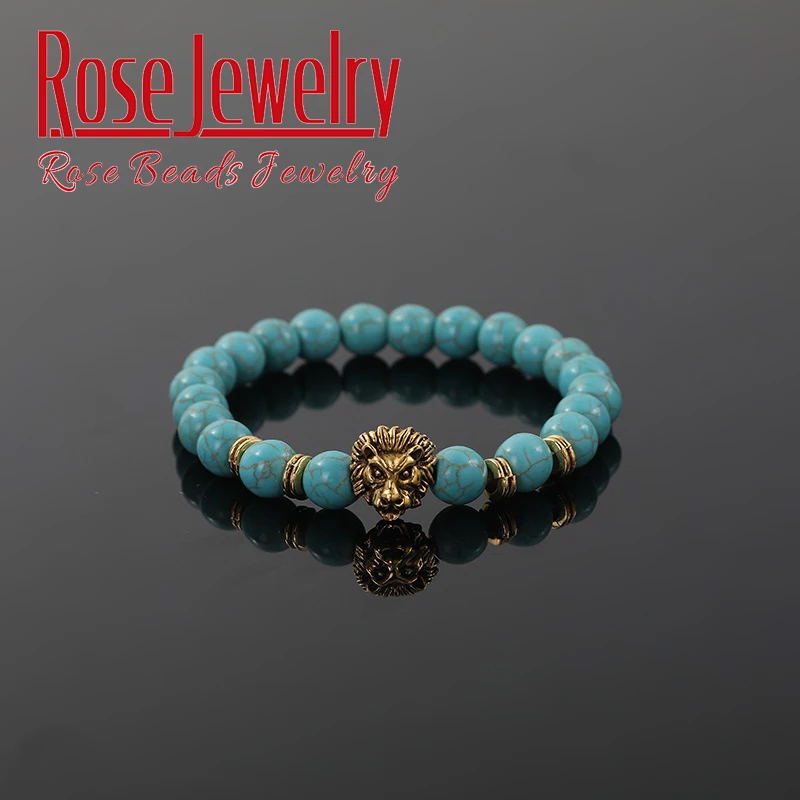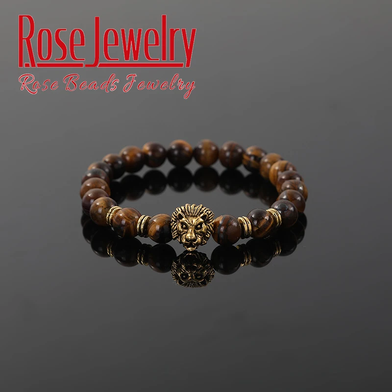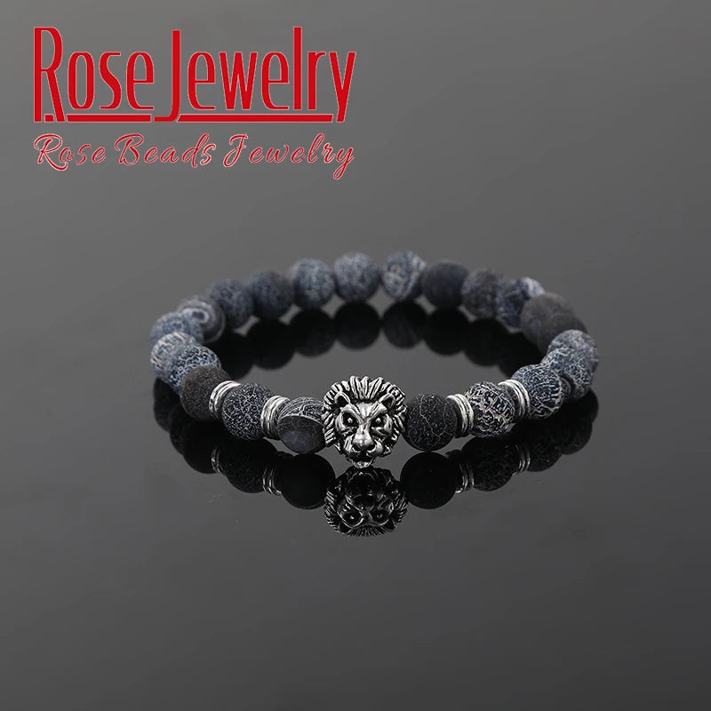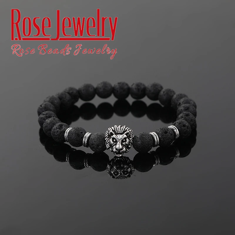 Men Bracelet Natural Stone Hematite Lava Beads Bracelet Gold Silver Color Lion Head Cown Charm Bracelet Jewelry for Women Men