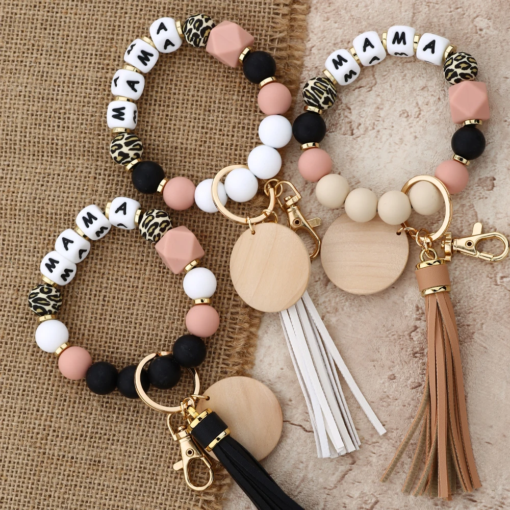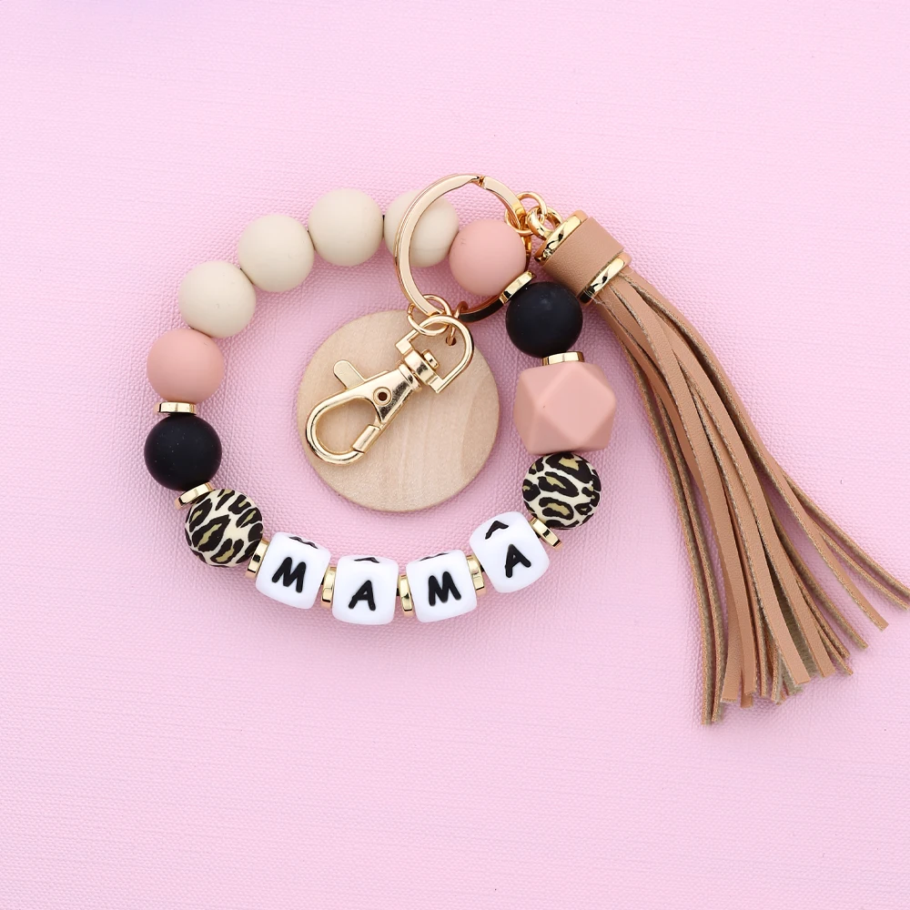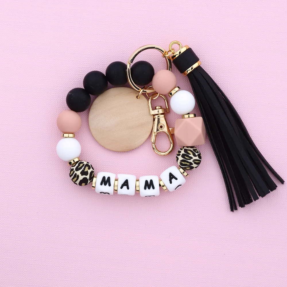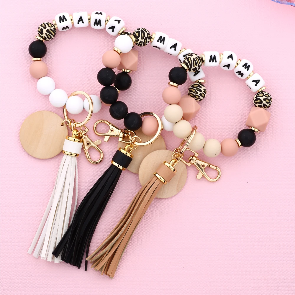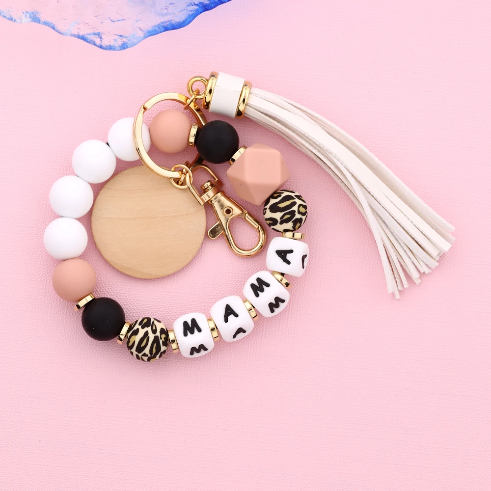 Mother's Day Gift Leopard Silicone Bead Key Chain Letter MAMA Beaded Wristlet Keychain With Wood Disc Leather Tassel Key Ring