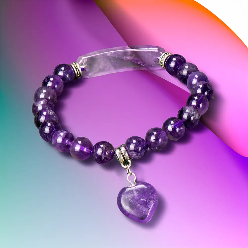 - Amethyst Heart Crystal Bracelet - Heart Charm Stone Bracelet. The beads in this bracelet are made of natural stone. Decorating with a polished rectangle stone and alloy metal beads. Hanging with a love heart stone. The heart has long been recognized across cultures as being a symbol for love, charity, joy and compassion.