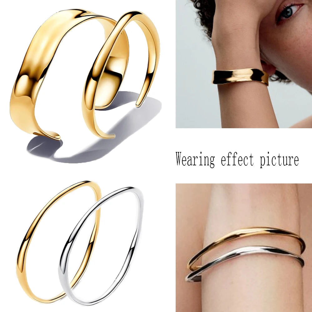 New Product 925 Sterling Silver Organically Shaped Broad Open Bangle&Gold and Silver Two Tone Delicate Bracelet