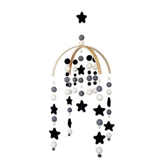 A beautifully detailed baby mobile with felt balls. Magical and lightweight, a perfect gift for the arrival of that special little person.