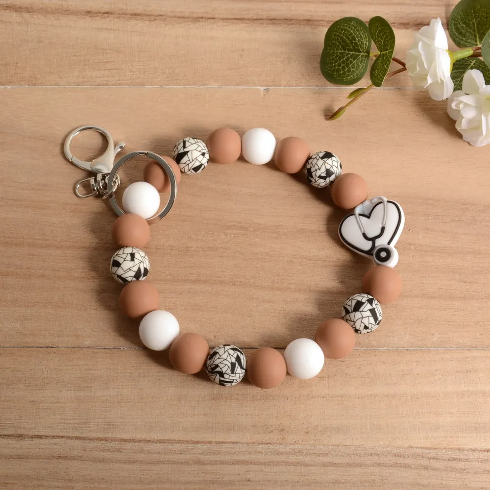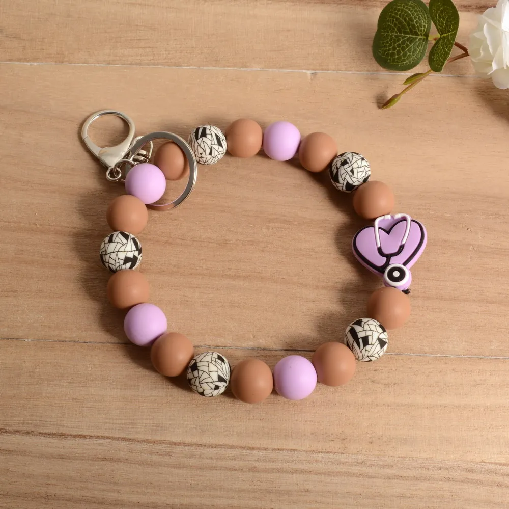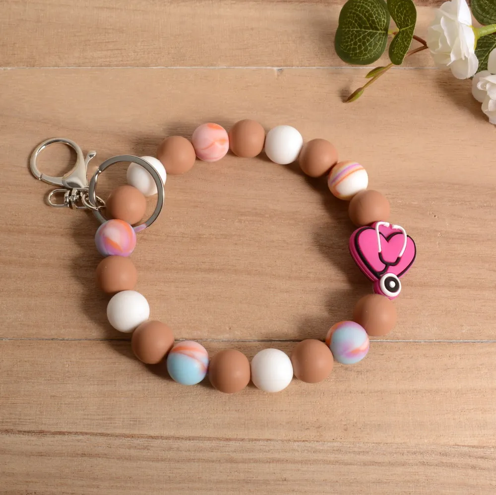 Personalized Bangle Silicone Bead stethoscope Stretch Wristlet bracelet Keychain with Keyring Gift for Teacher Mom Nurse Gift