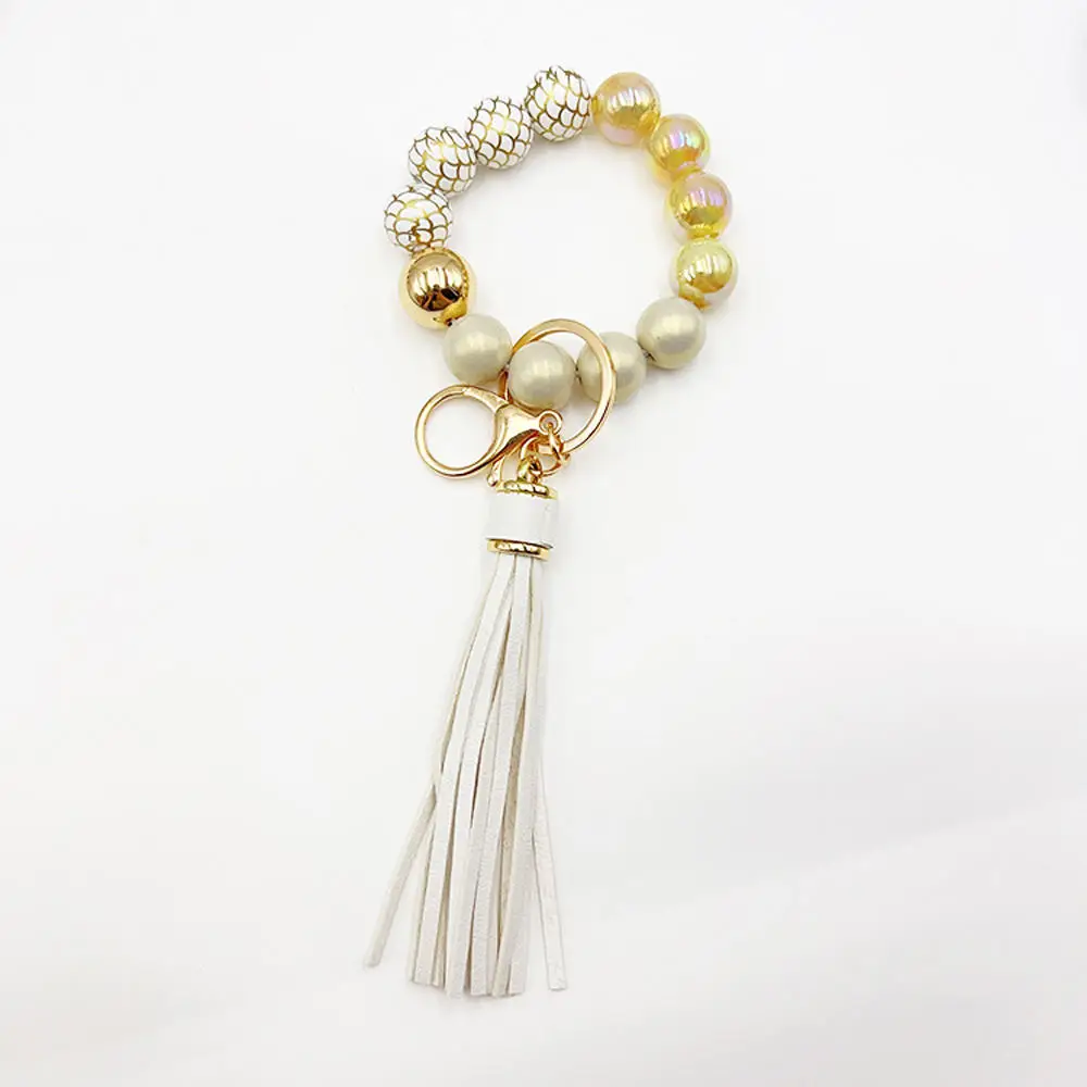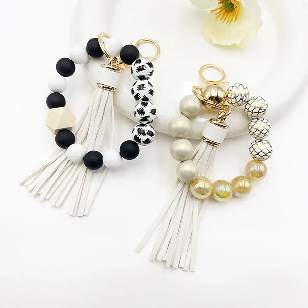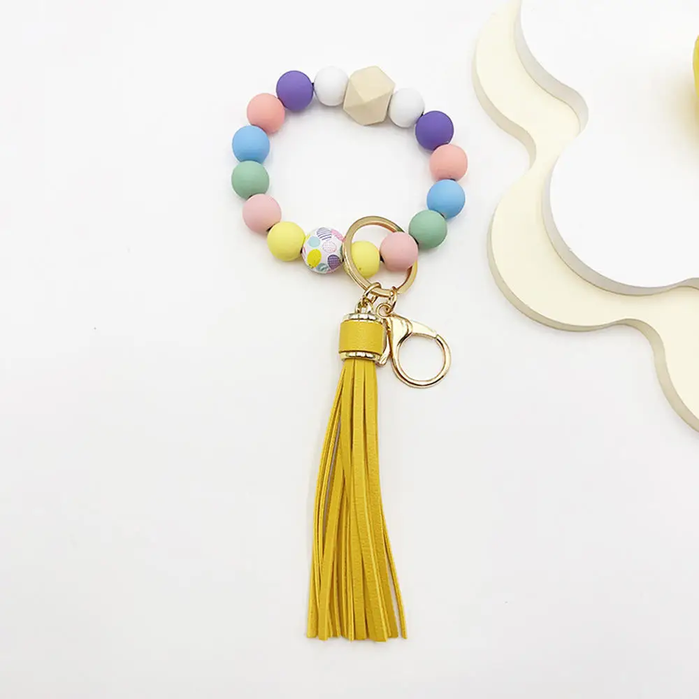 Silicone Bead Keychain Bracelet Key Ring Wristlet Key Chain For Women With Boho Tassel Bag Pendant Oatmeal