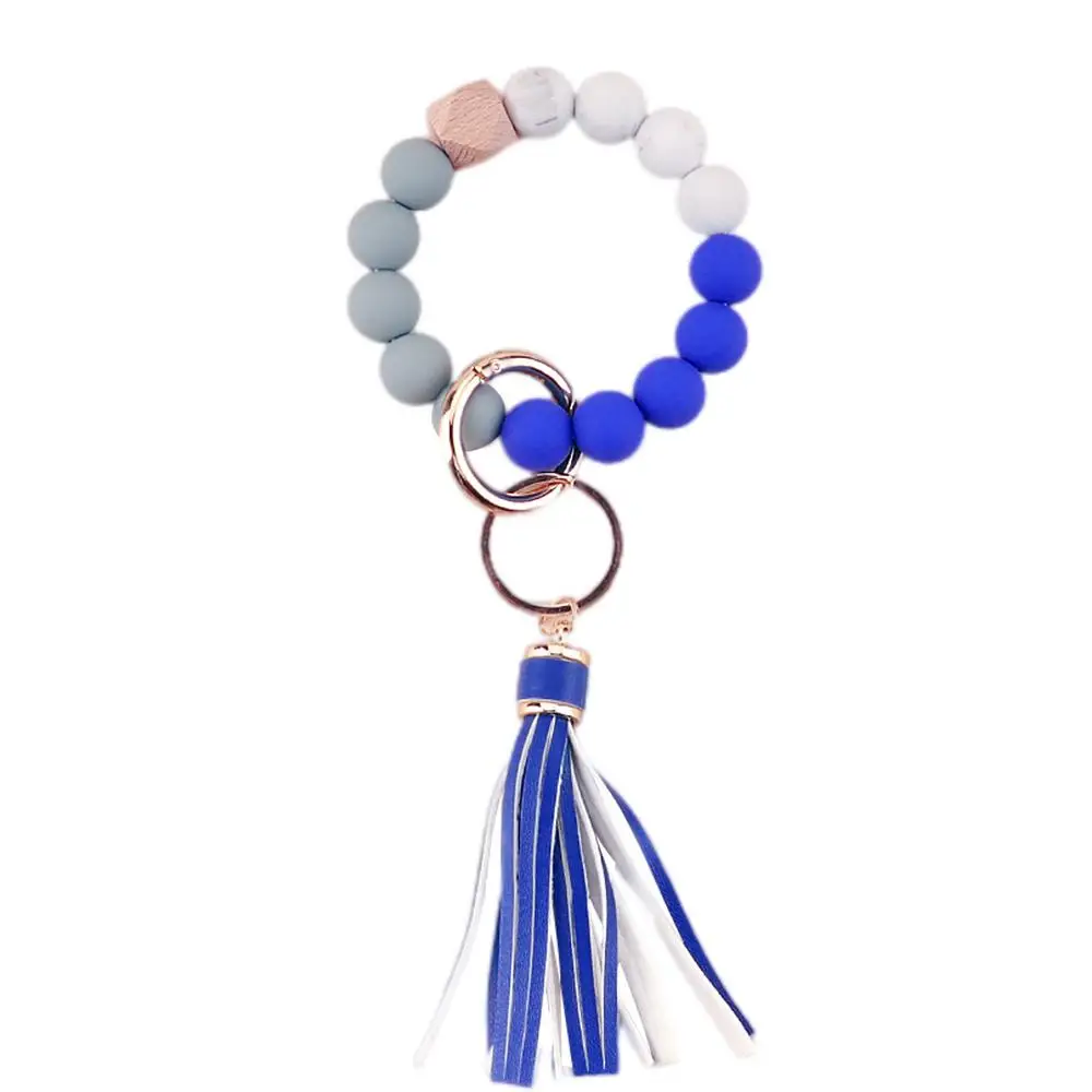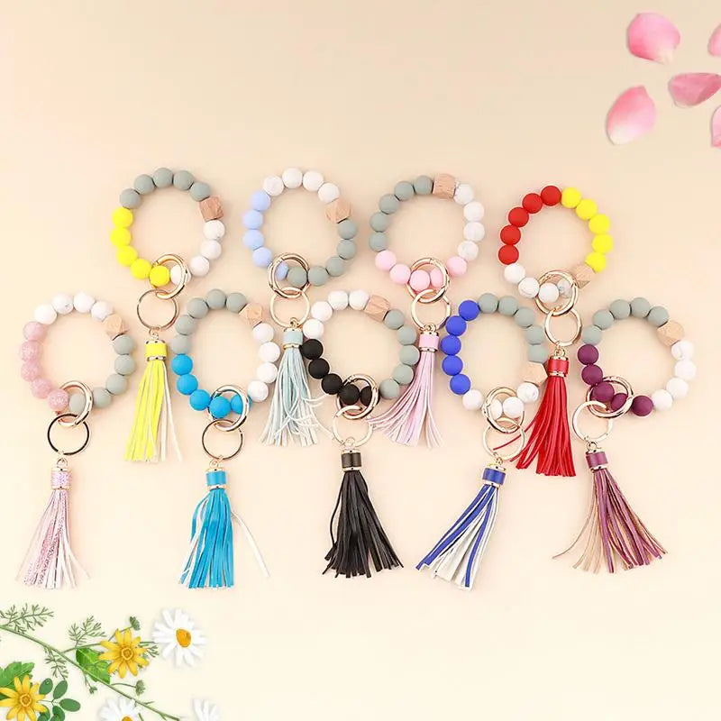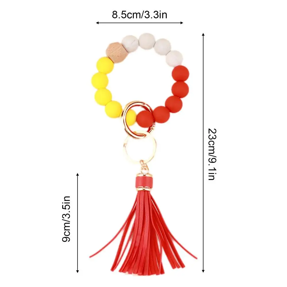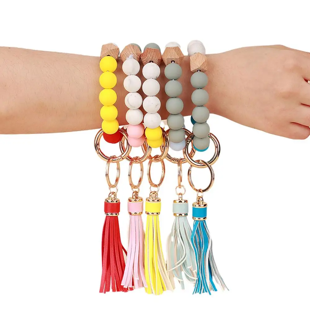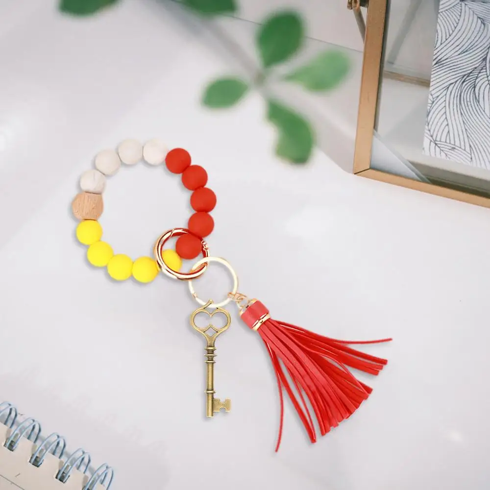 Silicone Key Rings Tangling Beaded Keyring Wristlet House Car Keyring Bangle Chains For Women With Leather Tassel