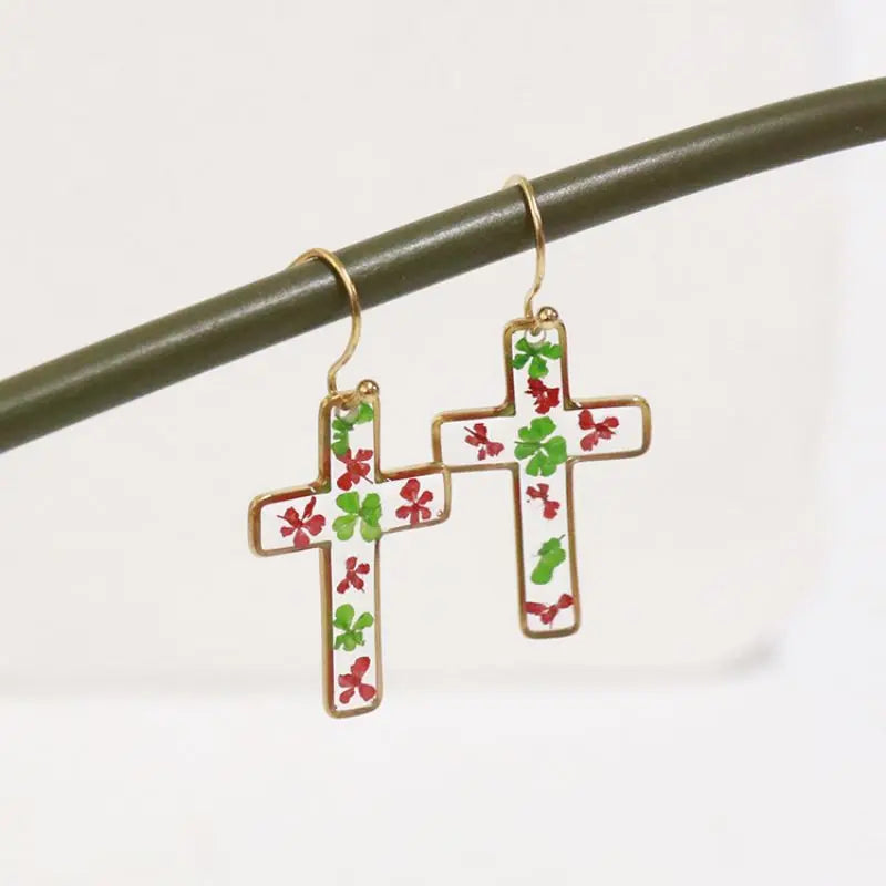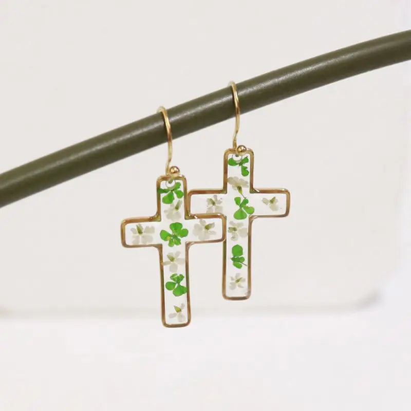 Unique Cross Earring With Flower Handmaking Epoxy Resin Pressed Flower Earring Natural Flower Statement Earring Jewelry 2024 New