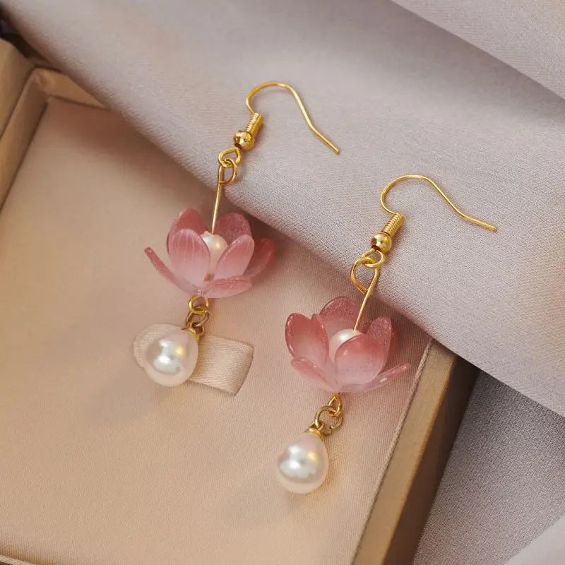 Unique Exquisite Lotus Earrings Elegant Pink Lotus Flower Drop Earrings Women Creative Statement Jewelry Wholesale Accessories