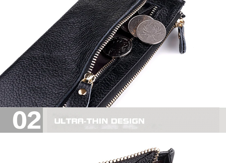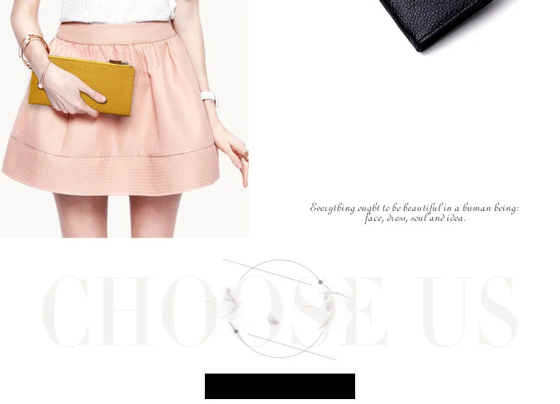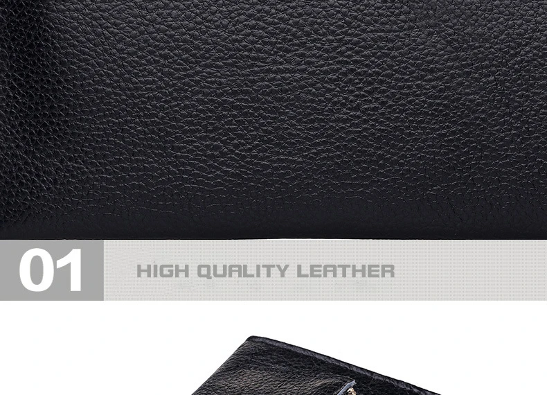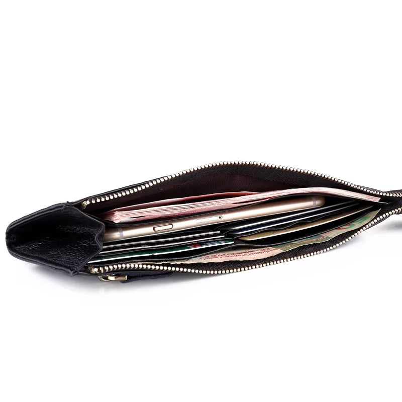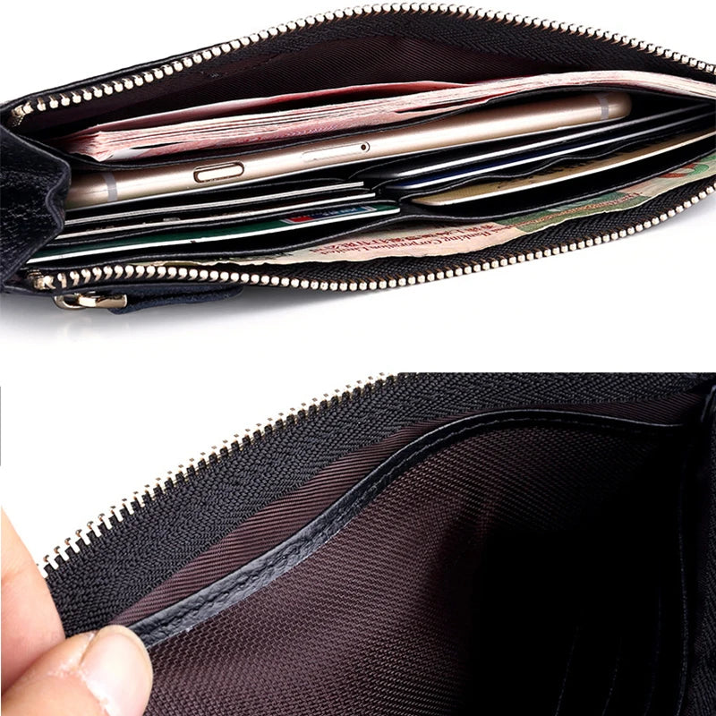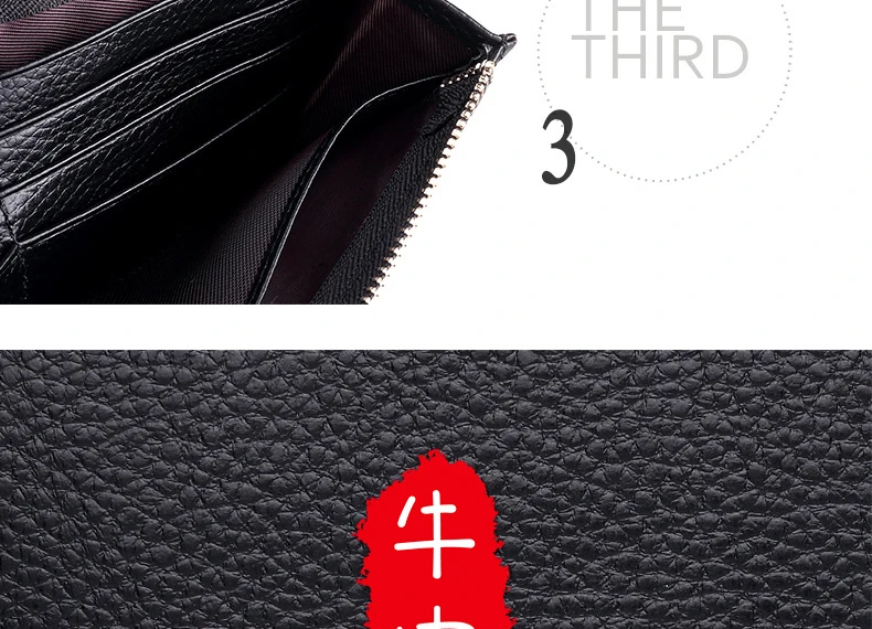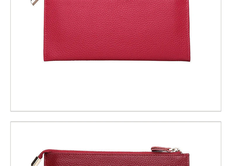 A main zipper compartment can load down a mobile phone, with 6 pockets for cards and a long pocket for money or receipt; a zipper pocket for coins.