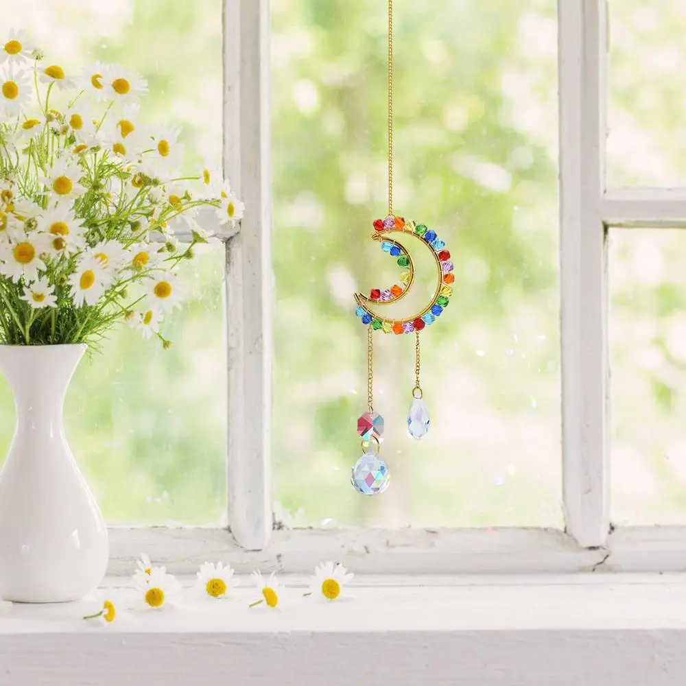 1.Patterned Sparkle: Delicate crystal window sun catcher with moon, stars, and heart pattern. Add a splash of color to your home and garden with this shining decor that creates a beautiful sunlit rainbow effect on window and walls.