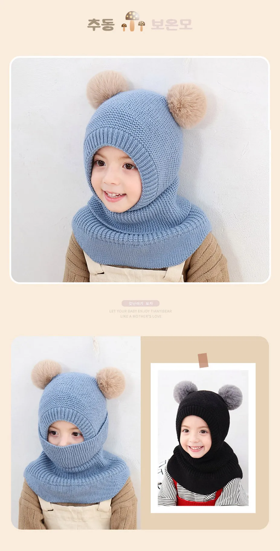 Winter Baby Balaclava Hat PomPom Knit Kids Beanie Hat for Baby Girl and Baby Boy Hat Scarf Double Layer
