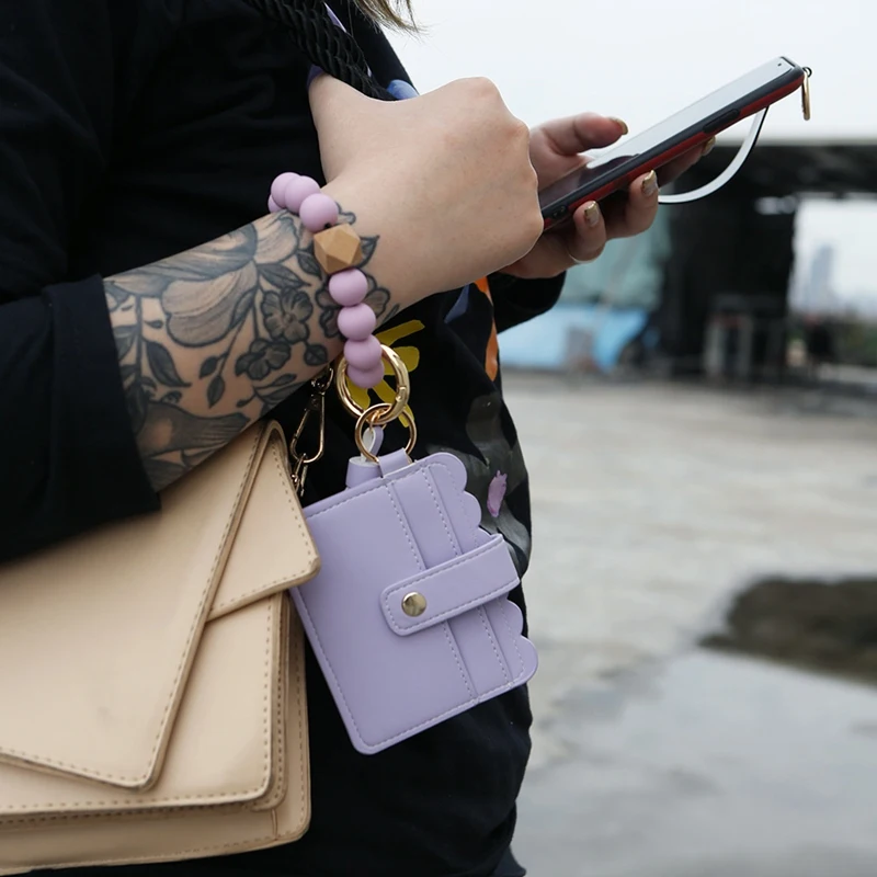 Wristlet Keychain Bracelet Credit Card Holder Wallet Key Ring Silicone Tassel Keychain Beaded Bangle For Women