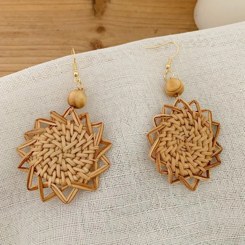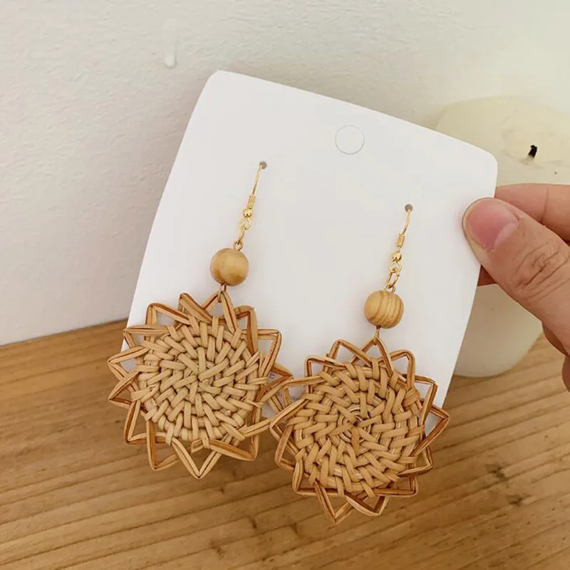 Hemasa Wooden Straw Weave Rattan Knit Vine Flowers Earrings For Women /Hollow Flora African wooden sr rings